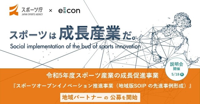日本最大級のオープンイノベーションプラットフォーム「AUBA(アウバ)」を運営する株式会社eiicon(エイコン 本社所在地:東京都港区虎ノ門、代表取締役社長:中村 亜由子、以下「eiicon」)は、2023年5月12日、スポーツ庁より、令和5年度スポーツ産業の成長促進事業「スポーツオープンイノベーション推進事業(地域版SOIP※の先進事例形成)」(以下「本事業」)運用業務を受託し、同日より、本事業にて全国最大3地域での開催を予定しているアクセラレーションプログラム「SPORTS OPEN INNOVATION BUSINESS BUILD」地域パートナーの公募を開始したことをお知らせします。