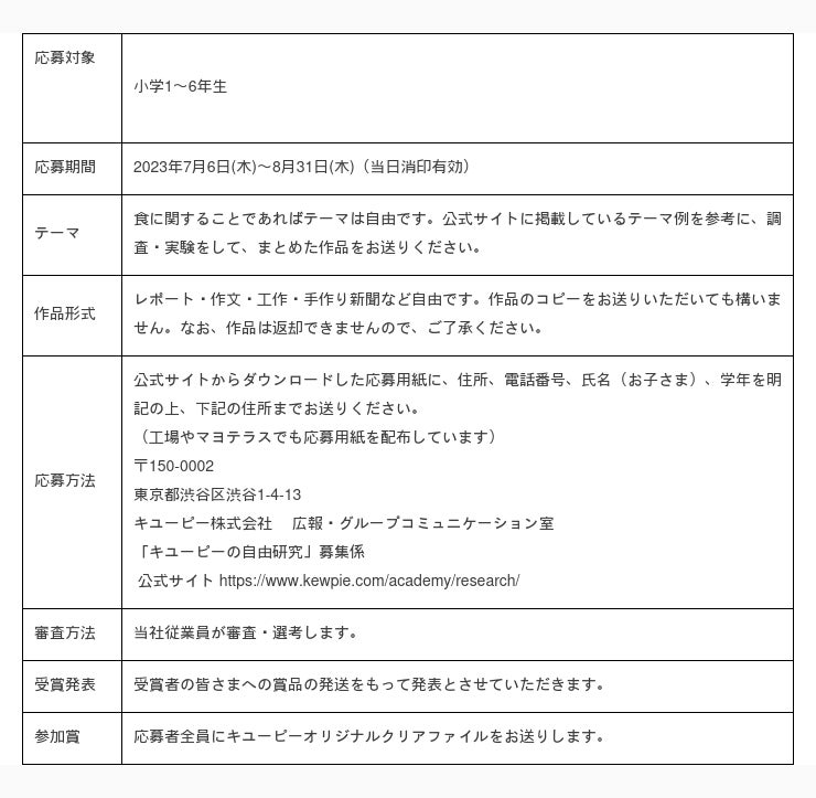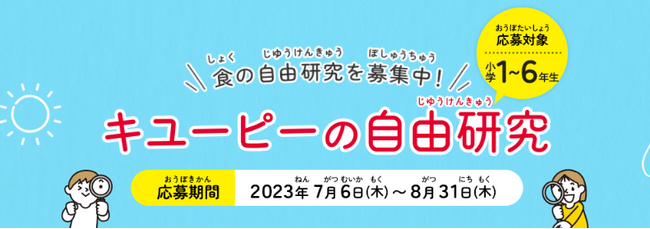 キユーピー株式会社(本社:東京都渋谷区、代表取締役 社長執行役員:高宮 満、以下キユーピー)は、キユーピー公式サイト内の食育コンテンツ『食生活アカデミー』で7月6日(木)から食に関する自由研究の募集を開始します。今年は新たに、自由研究の進め方をサポートする「自由研究お助けガイド」を制作し募集開始と同時に公開します。
