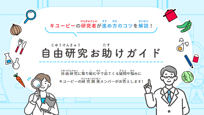 そこで今年は、少しでも自由研究のサポートをしたいという思いから「自由研究お助けガイド」を新設しました。本ガイドでは、キユーピー研究開発メンバーが自由研究の進め方についてアドバイスをしています。