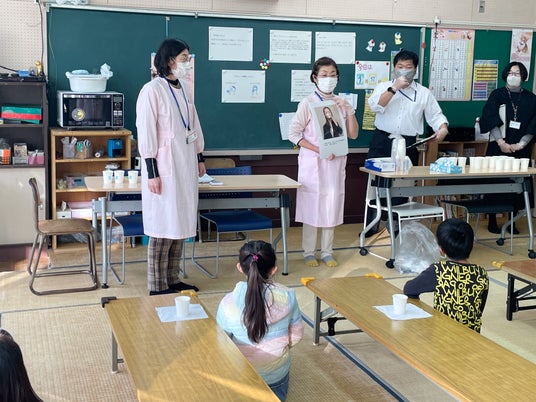 初日には2名の歯科専門職が放課後児童クラブを訪問し、おやつタイム後の児童に向けてフッ化物洗口の効果について説明を行いました。説明後、フッ化物洗口液が入った紙コップが児童に手渡されました。