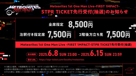 株式会社STPR (本社:東京都渋谷区 代表:柏原真人、以下STPR)は、弊社所属の2.5次元歌い手アイドルグループ「めておら - Meteorites -(以下、めておら)」が日本武道館にて開催する自身初のワンマンライブについて、2025年6月8日(日)23:00よりSTPR TICKET先行受付を開始したことをお知らせいたします。
