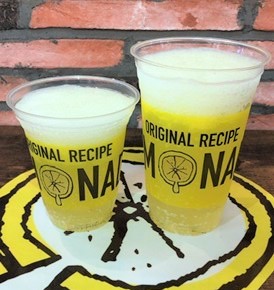 河野店長のオススメは、レモピナ。ソーダレモネードとフローズンレモネードの2層仕立ての新感覚レモネード。炭酸とフローズンのミックスが爽快感を作り上げ、かき混ぜながら飲むのがオススメです。