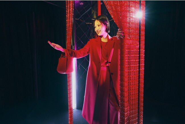 小物までもレッドで揃えたワントーンコーディネートは、ロマンティックな印象を演出します。すっきりとしたシンプルなラインのウール素材のテーラードコートに、ソフトな質感と曲線的なフォルムが特徴の A|Xロゴ入りのミニハンドバッグは、スタイリッシュでありながらフェミニンさをプラスします。ワードロープに取り入れることで、冬の重くなりがちなコーディネートにスパイスを加え、気分を盛り上げて。