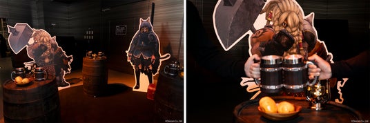 ※「酒場」を再現したフォトスポット。伝説の冒険者ゲルルフ、デボラの姿も