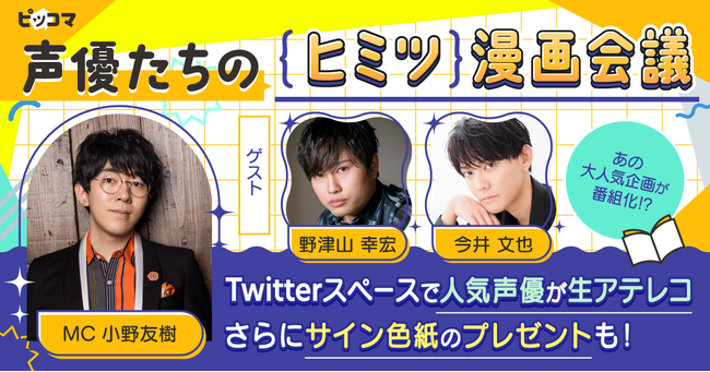 電子マンガ・ノベルサービス「ピッコマ」では、10/11(火)より、人気声優のマンガトークやSMARTOON(R)︎の生アテレコを楽しめる「声優たちのヒミツ漫画会議」を、ピッコマの公式Twitterスペースにてレギュラー番組化いたします。
