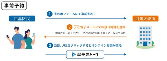 - 区職員が相談者のメールアドレスに予約確認の電子メールを送信し、相談日の前日に、ビデオトークの通話用URLを記載した電子メールを送信