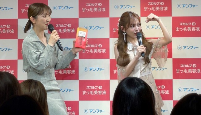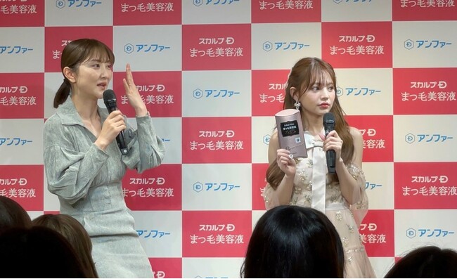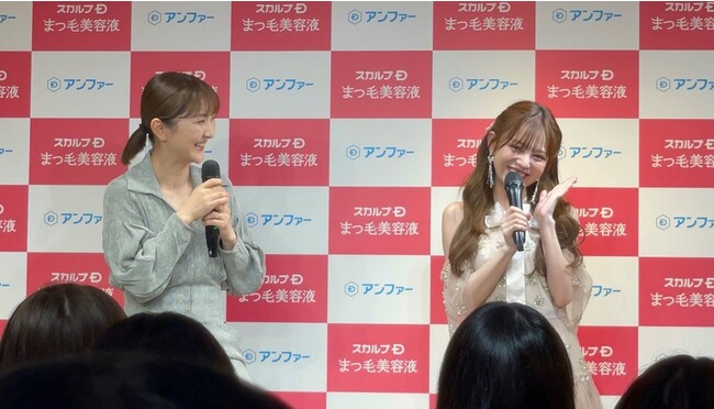 トークの中では、スカルプDまつ毛美容液シリーズを実際に使用した感想を伺う場面もありました。お二人が特にお気に入りだと話した「スカルプD ボーテ ピュアフリーアイラッシュセラム プレミアム」について、ちぃぽぽさんは「目の周りの肌が敏感なのですが、チップがふわふわで優しい使い心地でした。」とコメント。YUZUKOさんは、「お風呂上がりにすぐ塗るようにして、スキンケアのルーティーンにしていました」と話し、「普段からちぃぽぽちゃんのヘアメイクを担当しているなかで、撮影中はメイク直しが多いので目元に負担がかかってしまいがちなのですが、私もちぃぽぽちゃんも信頼して使っています。前回ちぃぽぽちゃんに会った時よりも存在感のあるまつ毛になった気がしました。」と、ちぃぽぽさんのまつ毛についてもコメントしました。