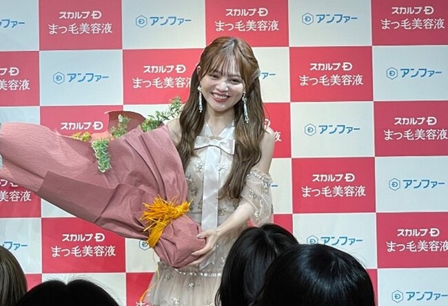 イベント当日はちぃぽぽさんのお誕生日ということもあり、スカルプDまつ毛美容液をイメージしたピンクの花束をプレゼント。現在、モデル業だけでなくアパレルブランドのプロデューサーとしても活躍しているちぃぽぽさんは、花束を受け取りながら「誕生日当日にファンの方に会えるのは初めてなので嬉しい」と話し、26歳の抱負について以下のように語りました。