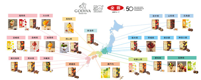 共に50周年を迎えた両者は、日本の食を支えるすべての生産者の皆さまを応援し、商品を通じて日本各地の食材を全国の沢山の方に届けたいという想いとともに、「GODIVA×全農 コラボレーションプロジェクト」を発足し、1年を通して全50種類のコラボレーション商品を展開しました。