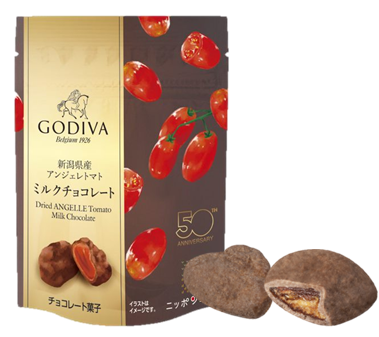まるでフルーツのような甘みをもつ、新潟県産アンジェレトマトを蜜漬けし乾燥させて、ベルギー産のミルクチョコレートでコーティング。濃厚なミルクチョコレートの甘みとほのかなトマトの酸味のマリアージュをお楽しみいただけます。