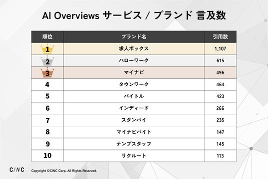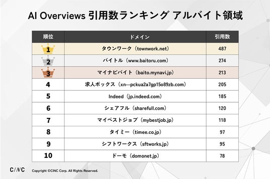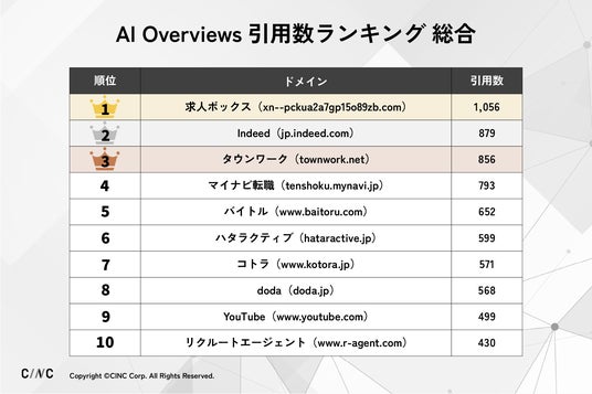 株式会社CINC(本社:東京都港区、代表取締役社長:石松友典、以下CINC)は、Google検索エンジンの「AI Overviews」における人材領域のWebサイトの引用状況を独自に調査し、ランキング形式でまとめました。