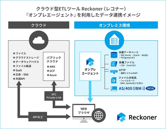 本機能により、「Reckoner」を通じて、AS/400(IBM i)のデータを各種クラウドサービスやデータウェアハウスへノーコードで連携することが可能になります。また、オンプレミス環境に対応した連携構成により、既存のセキュリティポリシーを維持したまま導入できます。