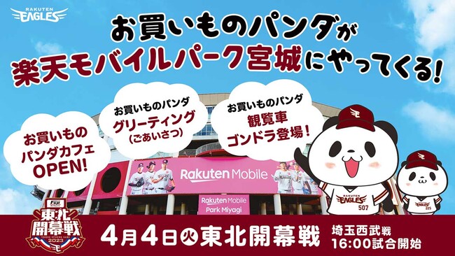 株式会社楽天野球団(本社:宮城県仙台市宮城野区、代表取締役社長:米田 陽介)は、楽天グループ株式会社の公式キャラクター「お買いものパンダ」が、4月4日(火)東北開幕戦(埼玉西武ライオンズ戦)を応援するため、楽天モバイルパーク宮城に来場することとなりましたので、お知らせいたします。