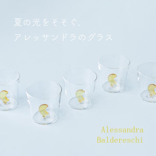 海に浮かぶ月明かりを連想させる「月のグラス」や大自然の動植物シリーズなど、人気のアイテムが揃っています。彼女の独特な世界観に熟練の職人による手吹き技法が織り成す、繊細で美しいプロダクトは、暑い夏の日に涼やかな風と爽やかな時を運んでくれます。アレッサンドラのグラスいっぱいに、夏のひかりをそそいでください。