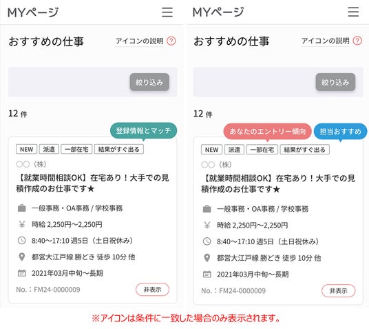 希望条件や経験、スキルにマッチするおすすめの仕事が表示されるため、自分に合った仕事をさらに見つけやすくなりました。絞り込み機能や吹き出しアイコン表示などの機能も備わり、利便性が向上しました。