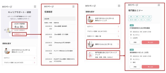 eラーニングや専門職種のセミナーなどの研修の受講履歴と年間の学習時間が表示されるため、学習の振り返りがしやすくなります。また学び方・内容・目的を明確にしながら、研修を探すことができるため、効率的に次のチャレンジができます。