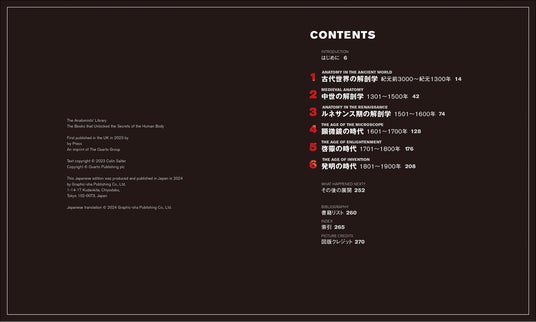 はじめに/1 古代世界の解剖学 紀元前3000~紀元1300年/2 中世の解剖学 1301~1500年/3 ルネサンス期の解剖学 1501~1600年/4 顕微鏡の時代 1601~1700年/5 啓蒙の時代 1701~1800年/6 発明の時代 1801~1900年