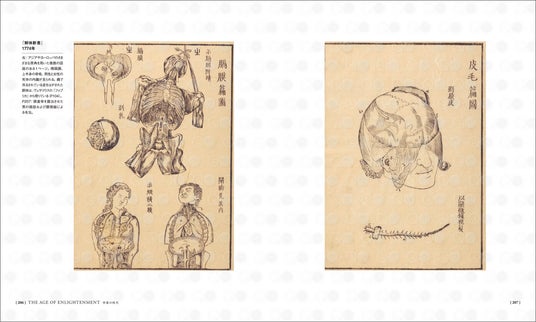 右「解体新書」アジアやヨーロッパのさまざまな原典を用いた複数の図版のある1ページ(1774年)