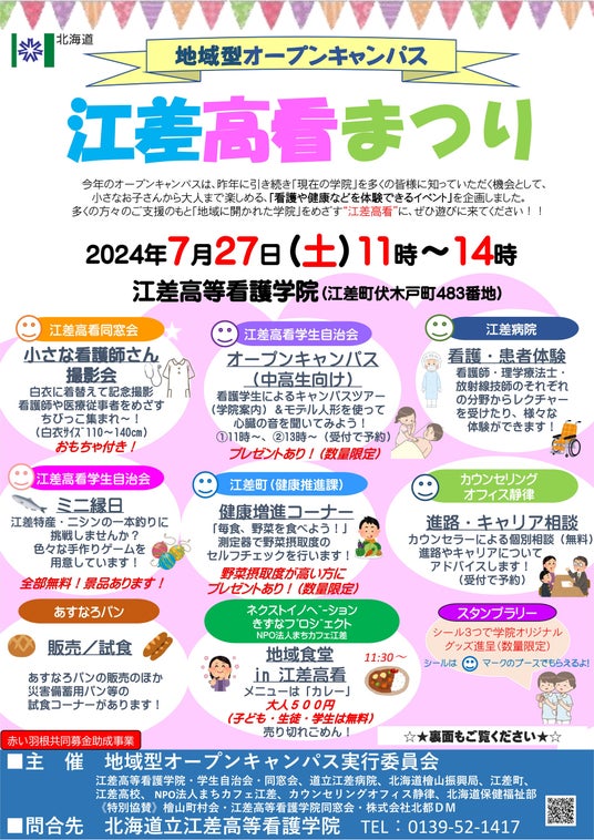 北海道立江差高等看護学院では、「現在の学院」を多くの皆様に知っていただく機会として、「江差高看まつり」(地域型オープンキャンパス)を開催します。多数の方々のご来場をお待ちしておりますので、ぜひお越しください。