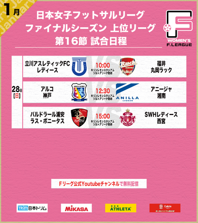 1月27日(土)、28日(日)に日本女子フットサルリーグ2023-2024 ファイナルシーズン 上位リーグ・下位リーグ 第16節を開催いたします。今節も、Fリーグ公式Youtubeチャンネル(https://youtube.com/@fleaguechannel?si=nme_yMSSA6JO5G1c)にてライブ配信いたしますので、ぜひご視聴ください!