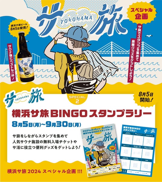 横浜サ旅ビールリリースを記念して、横浜のサウナ施設、飲食店、観光名所などを巡ってビンゴを完成させると豪華景品が当たる期間限定のスタンプラリー。