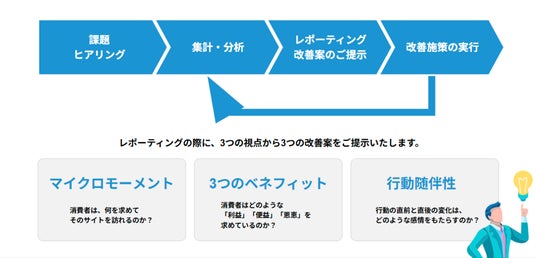 まず専門家が課題をヒアリング、そしてAIによるECサイトの分析を行います。その分析結果を元に専門家が具体的な改善案を盛り込んだレポーティングを行い、施策の実行までを伴走支援します。本プログラムでは「上級ウェブ解析士/上級SNSマネージャー/SEO検定1級」資格を持つコンサルティングアドバイザー 宮田 尚亮 がECの現場で実効性ある改善を提供します。