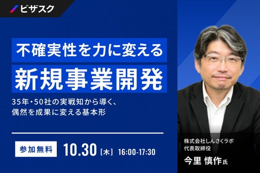 「知見と、挑戦をつなぐ」をミッションにグローバルなナレッジプラットフォームを運営する株式会社ビザスク(以下、当社)は、『不確実性を力に変える新規事業開発』をテーマに、株式会社しんさくラボ 代表取締役 今里 慎作氏 ご登壇による無料オンラインセミナーを 10/30 (木) 16:00 より開催します。