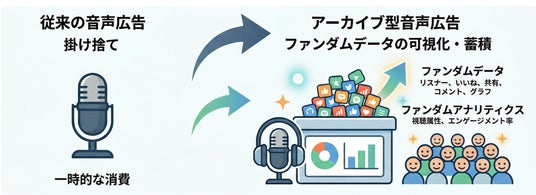 ・ストック型で好意を醸成:放送された広告は「音声CMチャンネル」にアーカイブされます 。一過性の“掛け捨て”で終わるのではなく、作品として長く聴き続けられることで、企業への好意に変換され続ける新しい広告体験を提供します 。