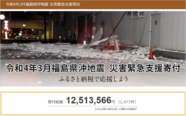 ふるさと納税ポータルサイト「さとふる」(https://www.satofull.jp/)を運営する株式会社さとふる(本社:東京都中央区、代表取締役社長:藤井 宏明)は、2022年3月17日に開設した「令和4年3月福島県沖地震 災害緊急支援寄付サイト」(https://www.satofull.jp/static/oenkifu/202203_fukushima.php)にて、3月24日より、岩手県野田村、宮城県多賀城市の寄付を受け付け開始します。これにより本サイトで扱う自治体数は20自治体となりました。3月24日午前10時時点で、本サイトを通して1,200万円以上(約1,500件)の寄付が寄せられています。各自治体に集まっている寄付総額などの最新情報は、「令和4年3月福島県沖地震 災害緊急支援寄付サイト」に記載しています。