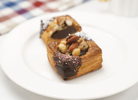 ●『ポンパドウル』キャラメルナッツチョコ(1個) 356円【SHINJUKU DELISH PARK】デニッシュ生地に濃厚なガナッシュチョコをたっぷり乗せました。チョコとキャラメルナッツが相性抜群なバレンタイン限定パンです。