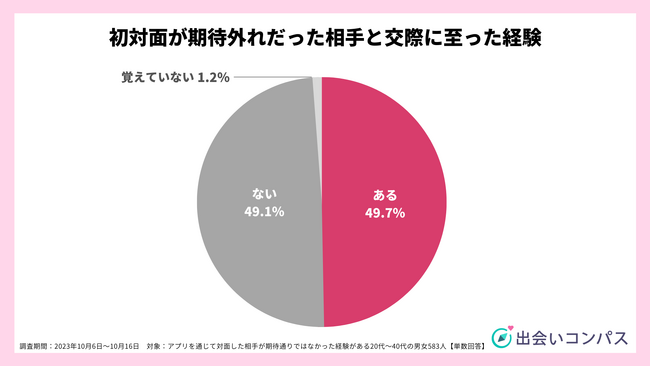 初対面が期待通りではなかった相手と、交際に至った経験はあるか尋ねると、「交際したことがある(49.7%)」、「交際したことがない(49.1%)」と、ほぼ同数の結果でした。