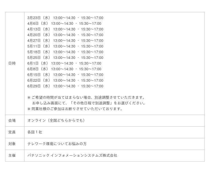 パナソニック インフォメーションシステムズ株式会社は、 2022年3月23日(水)から2022年6月29日(水)にかけて各回1社限定の、どう選ぶ?テレワークのための「VDI」「VPN」「RDP」 etc. オンライン個別相談会を実施します。