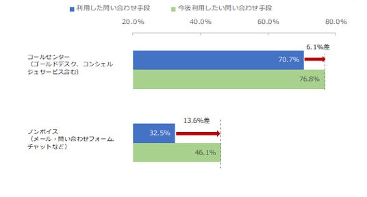 また、今後利用したい問い合わせ手段として、「コールセンター」を選んだ利用者は76.8%と、現状の利用状況と比べて6.1%程度上回ったのに対し、「ノンボイス」においては今後利用したい問い合わせ手段として選択した利用者は46.1%と、現状の利用状況と比べて13.6%の差分となり、現状の利用状況と今後の利用意向のギャップが大きくなりました。今後コールセンターだけでなく、有人チャットやAIチャット・チャットボットといったノンボイスによる問い合わせ手段についても期待される傾向となりました。