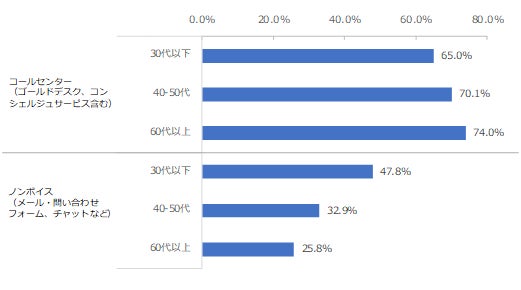 年代別に分析したところ、「コールセンター」は30代以下(65.0%)よりも40-50代(70.1%)や60代以上(74.0%)において利用率が高くなりました。一方で、「コールセンター」以外の「ノンボイス」では30代以下で47.8%と他年代に比べて利用率が高くなり、若年層においては「ノンボイス」での問い合わせが多い傾向となりました。