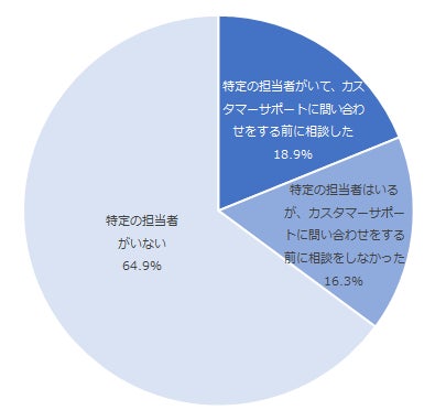 保険のライフプランナーや自動車保険の営業といった特定の担当者の有無と、カスタマーサポートに連絡する前に担当者に連絡をしたか調査をしたところ、全体のうち「特定の担当者がいてカスタマーサポートに問い合わせする前に相談した」と回答した利用者は18.9%、また「特定の担当者はいるが、カスタマーサポートに問い合わせをする前に相談をしなかった」と回答した利用者は16.3%となりました。