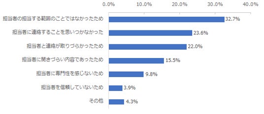 「特定の担当者はいるが、カスタマーサポートに問い合わせをする前に相談をしなかった」と回答した利用者に対し、その理由を調査したところ、「担当者の担当する範囲のことではなかったため」が32.7%と最も多く、次いで「担当者に連絡することを思いつかなかった」(23.6%)、「担当者と連絡が取りづらかったため」(22.0%)、「担当者に聞きづらい内容であったため」(15.5%)が続きました。