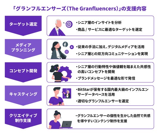 本サービスでは、BitStarのインフルエンサーマーケティングの知見とHakuhodo DY ONEのシニアマーケティングに関するナレッジを融合し、シニア層に向けた効果的なマーケティング施策を一貫サポートします。