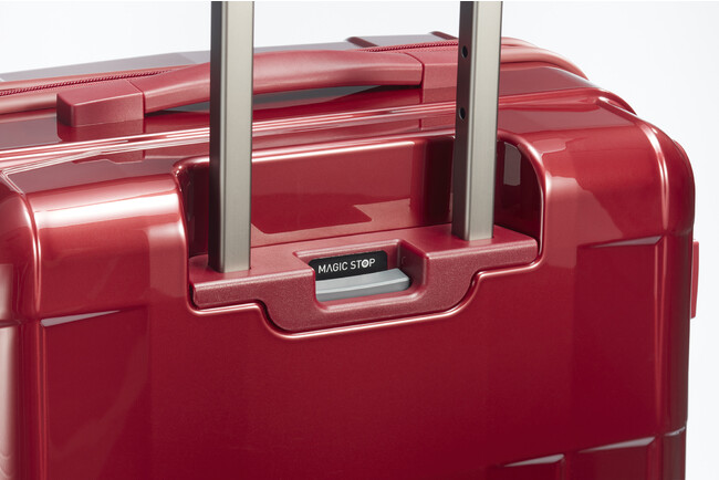 手元スイッチで簡単に車輪を固定できる、独自開発・特許取得のキャスターストッパー機能「マジックストップ(R)」搭載。揺れる電車の中や傾斜のある場所などで不意な走行を防ぎます。
