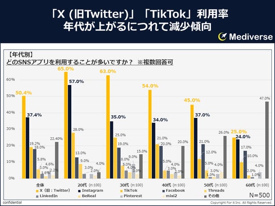 「X (旧Twitter)」「TikTok」は年代が上がるにつれて減少しているのに対し、「Facebook」「その他(うち非利用層が7割強)」は年代が上がるにつれて増加傾向にあることがわかる。