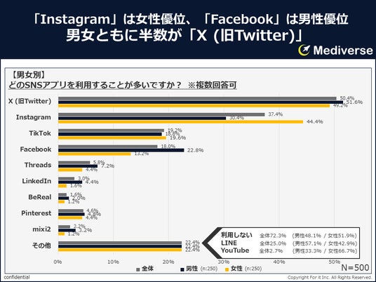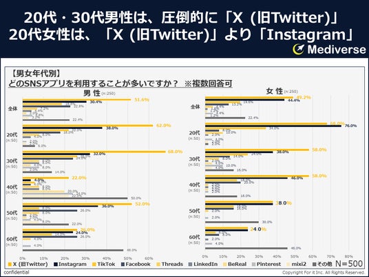 男女ともに、「X (旧Twitter)」が半数前後を占めていることは変わりないが、「Instagram」は女性が男性の1.5倍近く上回っており、それに反し、「Facebook」「Threads」「LinkedIn」「mixi2」は男性が女性の1.6~3倍近く上回っていることが見てとれる。