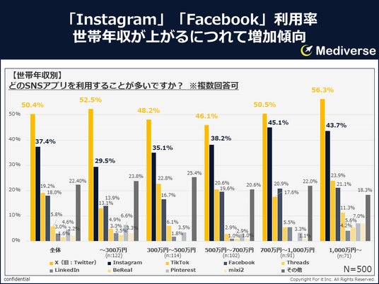 「Instagram」「Facebook」の利用率は、世帯年収が上がるにつれて伸びていることがうかがえる。