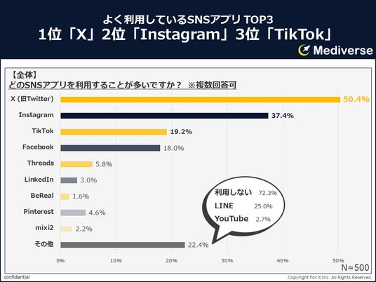 「どのSNSアプリを利用することが多いか」と聞いてみたところ、「X (旧Twitter)」50.4%がもっとも多く、「Instagram」37.4%、「TikTok」19.2%、「Facebook」18.0%と続いた。