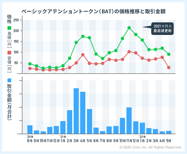 2020年8月に始値25.451円をつけたベーシックアテンショントークン(BAT)は上下を繰り返しながら上昇し、2021年11月に史上最高値となる213.311円をつけました。