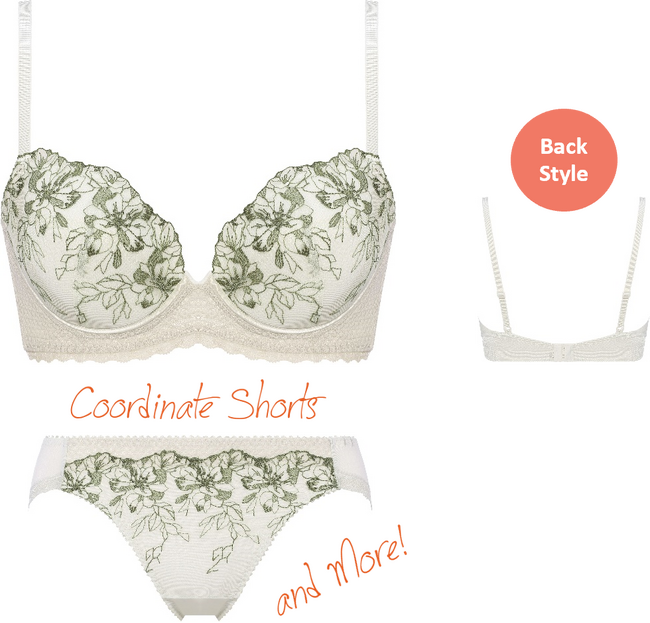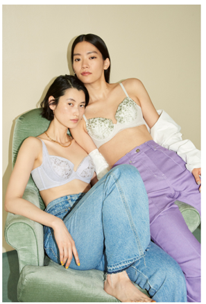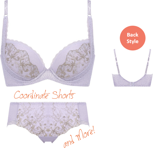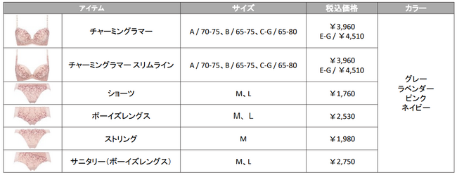 ブラジャーは、脇の上辺のプニ肉をおさえ、すっきりシルエットをメイクする「チャーミングラマー」と、脇高設計で脇~背中全体をすっきりおさえる「チャーミングラマー スリムライン」の2タイプをご用意しました。秋にぴったりの、ロマンティックな4色からお選びください!