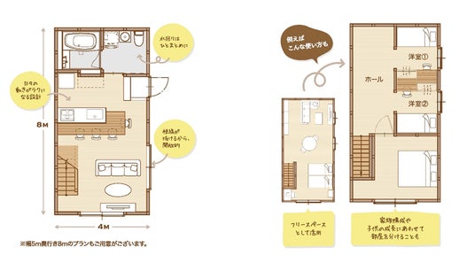 2階は自由にカスタムができるフリースペースとして。趣味やお仕事のワークスペース、子ども部屋、収納など、ジブンの暮らしを基準に創造できるため、間取りのイメージも広がります。