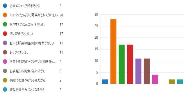 おすすめポイントとして、最も多くの票を集めたのは「キャベツたっぷりで野菜が摂れてうれしい」というポイントでした。以下2位は「おかずとごはんの相性がいい」、「タレの味がおいしい」です。
