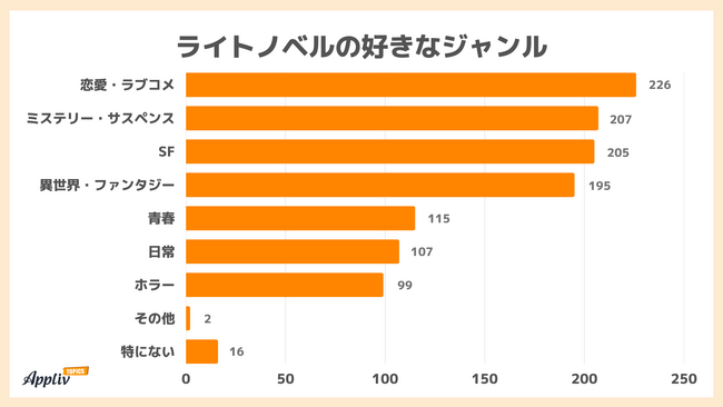 最多は「恋愛・ラブコメ」で226人。その後に「ミステリー・サスペンス」207人、「SF」205人、「異世界・ファンタジー」195人が続きます。