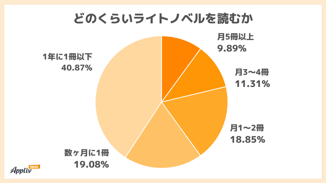 ライトノベルを読む人の中で、月1冊以上読む人は40.05%。月5冊以上読むのは9.89%。