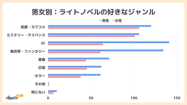 男女別で見ると、男性は「SF」「異世界・ファンタジー」、女性は「恋愛・ラブコメ」「ミステリー・サスペンス」の人気が高いです。