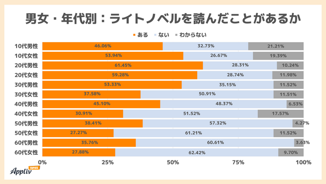 ナイル株式会社(本社:東京都品川区、 代表取締役社長:高橋飛翔、 以下ナイル)が運営する「Appliv TOPICS」にて、15~69歳男女1,970人を対象に、2023年10月4日~10月11日の期間、ライトノベルに関する調査を実施しました。